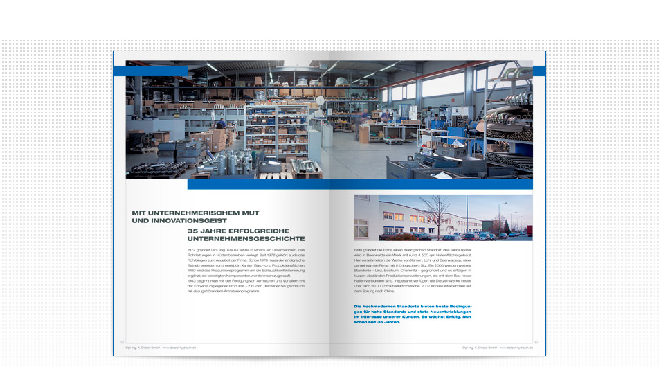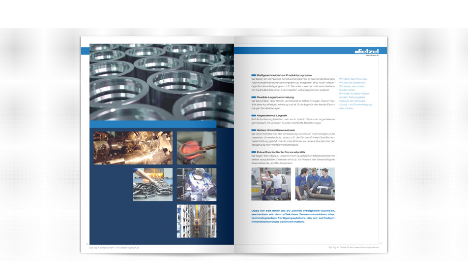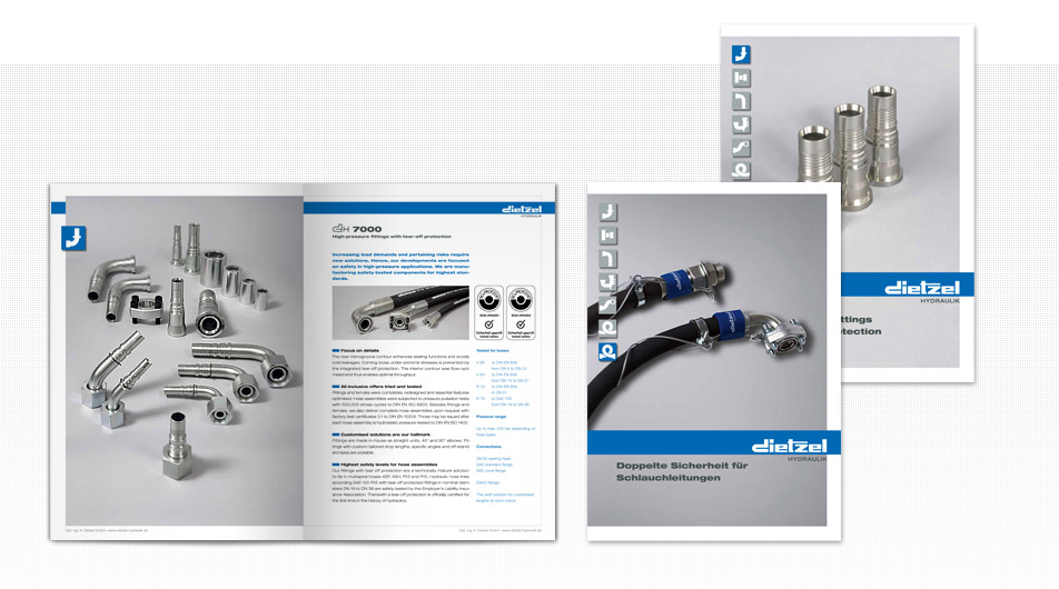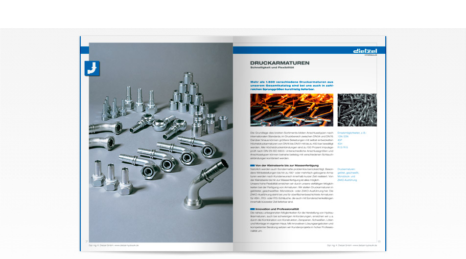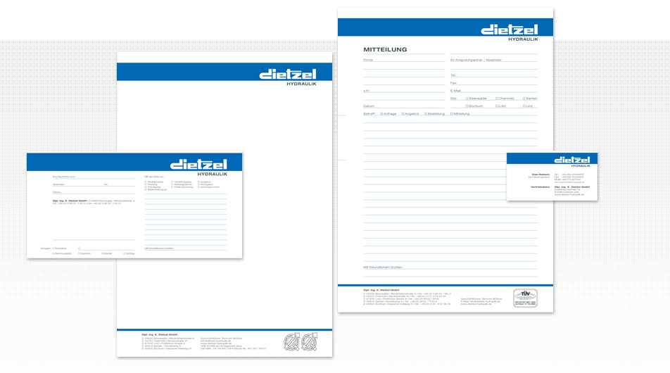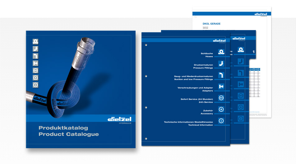 Für den Kunden »Dietzel Hydraulik« wurden alle gestalterischen und konzeptionellen Elemente einer Corporate Identity sowie deren Anwendung im Medienmix entwickelt.