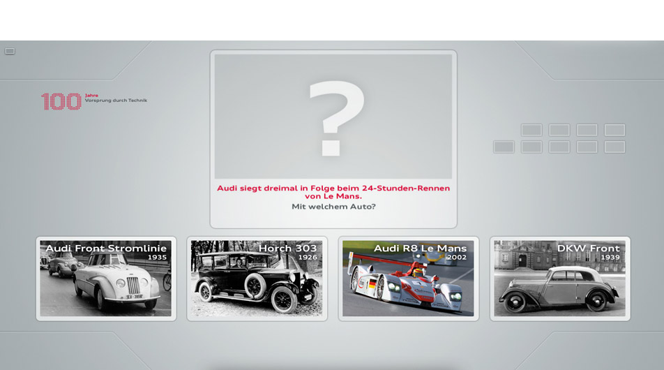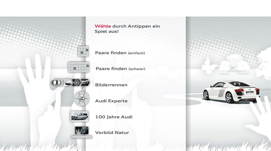 Zusammen mit Marketingexperten aus München und Kassel entwarf ö_konzept im Audi Forum Ingolstadt ein kind- und jugendgerechtes Edutainmentangebot. Innovative Spielideen und die hohe ästhetische Qualität der Installationen, die ö_konzept dafür entwickelte, spiegeln die Firmenkultur des Premiumherstellers wieder. Es entstand ein abgestimmtes Angebot an Geschicklichkeits- und Wissensspielen für den jungen Besucher.
