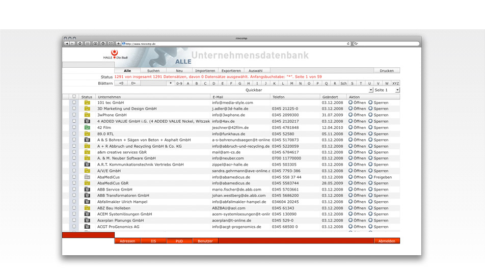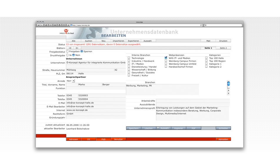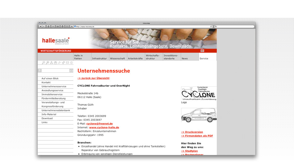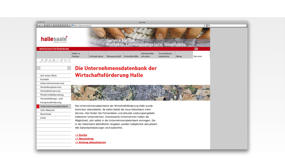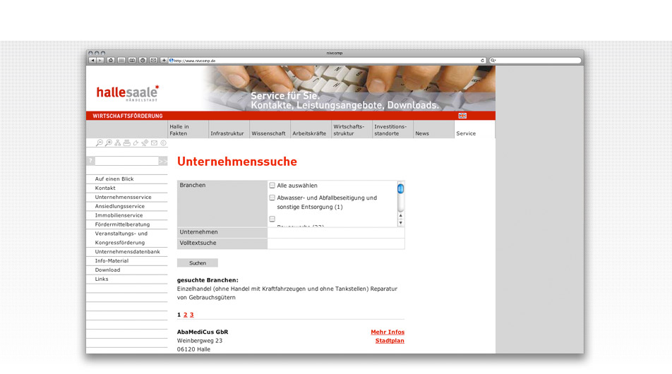 Für die Wirtschaftsförderung Halle entwarf und programmierte ö_konzept eine im Internet verfügbare Unternehmensdatenbank mit allen Firmendaten und aktuellen Leistungsangeboten hallescher Unternehmen. Die darin gelisteten Unternehmen können nach Branchen sortiert und nach allen relevanten Informationen durchsucht werden. Dem Dienst angeschlossen sind eine PDF-Ausgabe sämtlicher Infos, ein Anfahrtsplan sowie eine automatische Anfahrtsrouten-Erstellung.