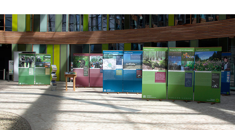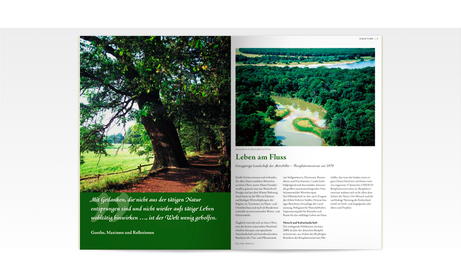 Sehen lernen – die Metapher verknüpft als konzeptionelle Basis Natur, Freigelände und Ausstellungspavillon des Informationszentrums zu einer Erlebniswelt. Die landschaftsformende Elbe durchzieht als Stahlband den Pavillon. Ein Überflutungsmodell, eine steuerbare Gierseilfähre, Tierpuzzles, ein Spinnennetz zum selber Spinnen, inszenierte Präparate und ein begehbarer Biberbau machen die Vorgänge der Natur sichtbar. Interaktive Präsentationen und Text-Bild-Tafeln ergänzen das Erfahrene mit Detailinformationen und Kontextwissen. Das systematische Verwenden von Farbe und Typografie verdeutlicht die Zuordnung des einzelnen Phänomens zum komplexen Ganzen des Biosphärenreservats.