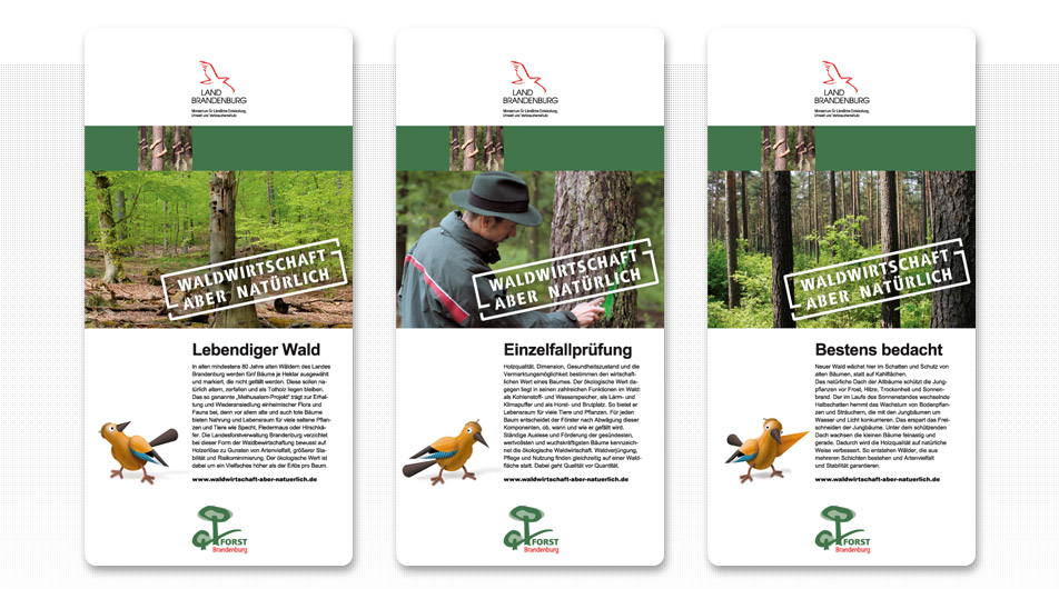 Für eine Imagekampagne mit dem Thema ökologische Waldwirtschaft entwarf ö_konzept nach sorgfältiger Konzeptphase das gesamte Erscheinungsbild der Marke »Waldwirtschaft aber natürlich!«. Hierbei wurde Wert gelegt auf naturverknüpfte Visuals und Texte. In Verbindung mit Fotografie, Text und Grafik wurden Infomaterialien, Giveaways, ein Maskottchen sowie verschiedene Lehrspiele um die Kampagne entworfen, welche dann sowohl im Wald wie auch im Internet und in Infozentren Verwendung fanden.