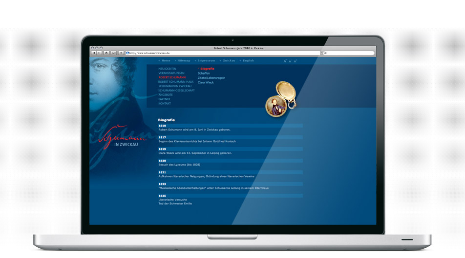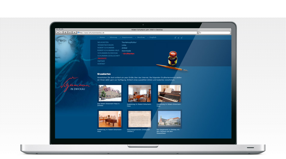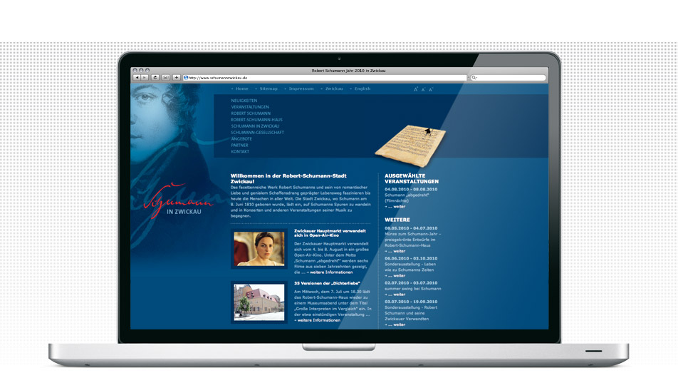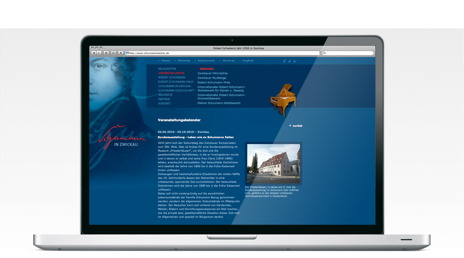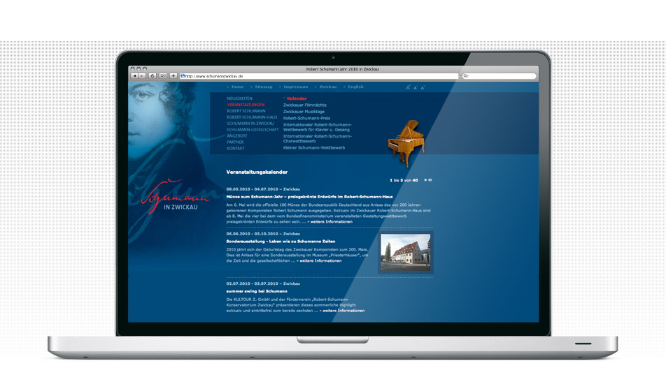 Umgesetzt wurde ein zweisprachiges Portal mit Content-Management-System. Neben den Informationen zum Schaffen des Künstlers, werden international bekannte Veranstaltungen wie der Robert-Schumann-Wettbewerb kommuniziert. Darüber hinaus werden auch das als Museum und Forschungsstätte bekannte Robert-Schumann-Haus in Zwickau sowie Festveranstaltungen im Rahmen seines 200. Geburtstags im Portal vorgestellt.