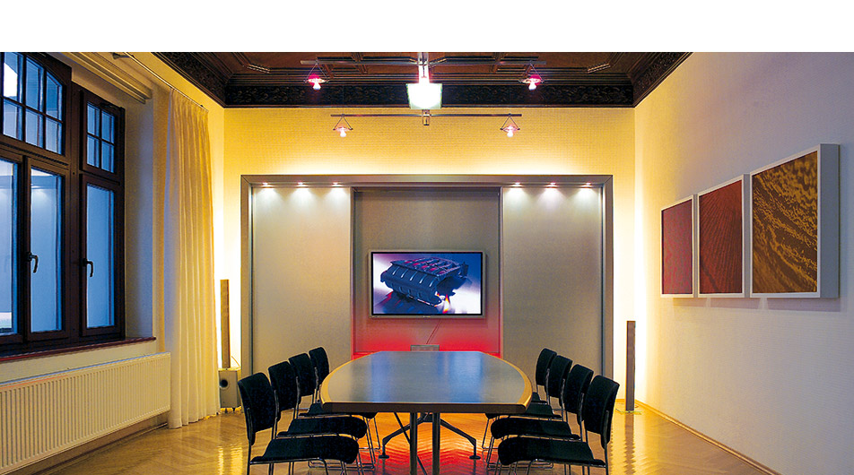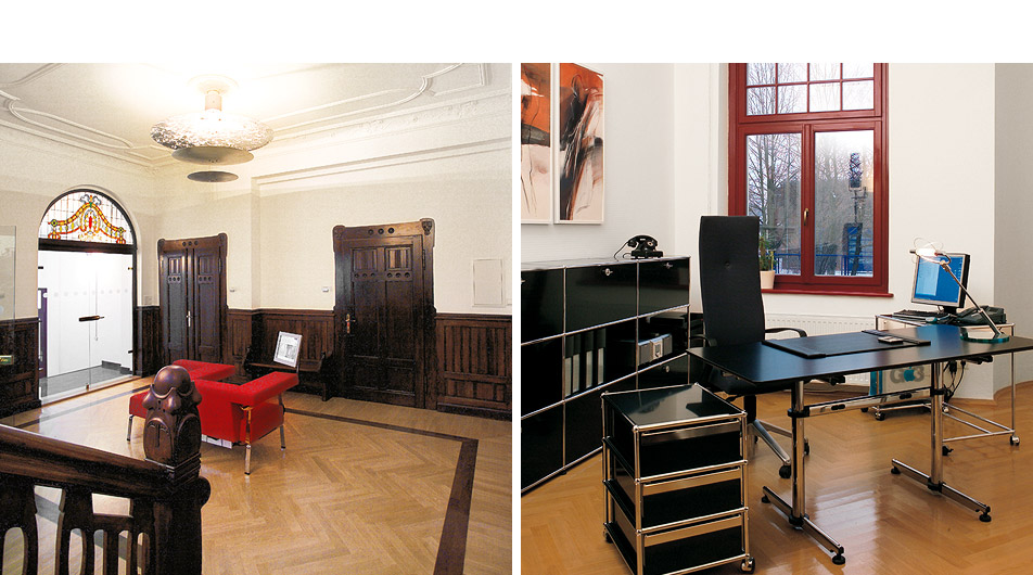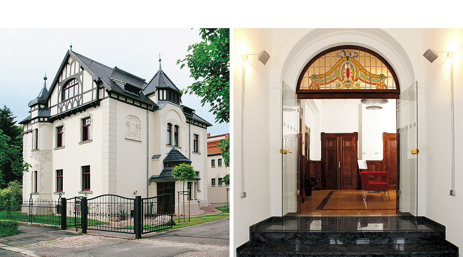 Die schöne Jugendstil-Villa, die ein Weinhändler Ende des 19. Jahrhunderts für sich erbauen ließ, wurde durch wechselnde Nutzer sowie anschließendem Leerstand in einen ausgesprochen schlechten baulichen Zustand versetzt. Nach Abriss aller nachträglichen Einbauten kamen teilweise gut erhaltene Baudetails wie Stuckdecken, Füllungstüren und Wandbekleidungen zum Vorschein. Teile der farbigen Bleiverglasungen mit typischen Weinlaubmotiven, alte Gussheizkörper und die großzügige Treppenanlage konnten aufgearbeitet und vervollständigt werden. Kontraste zwischen sachlich modernen Einbauten, Büromöbeln, Designobjekten und der fast 100-jährigen Innenarchitektur der Villa wurden konsequent ausgespielt. Das Objekt bekam 2005 den Bauherrenpreis durch das Architekturforum der Stadt Zwickau.