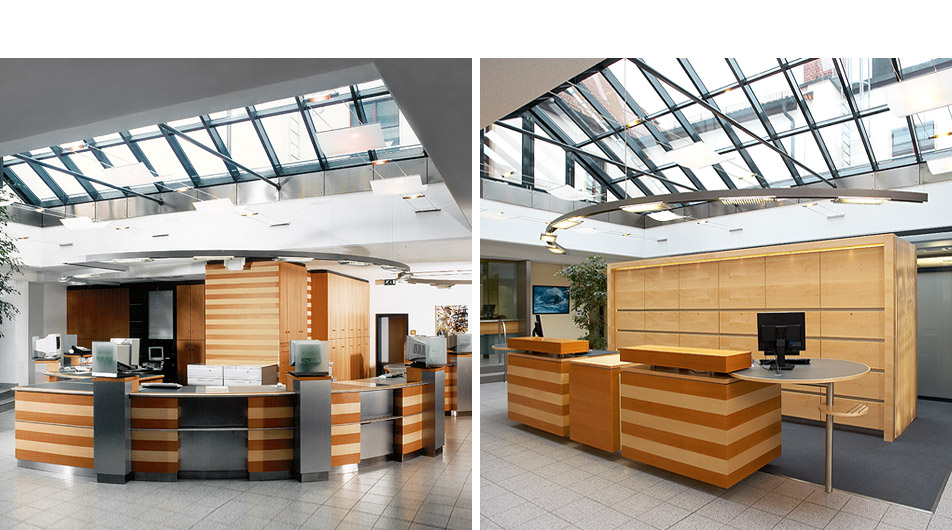 Die Konzeption von 1998 mit markanter schlangenförmiger Tresenanlage als Anlaufpunkt für Service und Beratung entsprach nicht mehr den aktuellen Anforderungen an diskrete Kundenberatung in der traditionsreichen Zentrale. Es fehlte an akustisch und visuell abgeschirmten Beratungsräumen. Die Herausforderung bestand in der Integration funktionaler Veränderungen ohne Zerstörung räumlicher Transparenz. Mit dem Umbau gelang es, neue Elemente in die bestehende Raumstruktur harmonisch zu integrieren ohne den Charakter der Räume zu verfälschen.