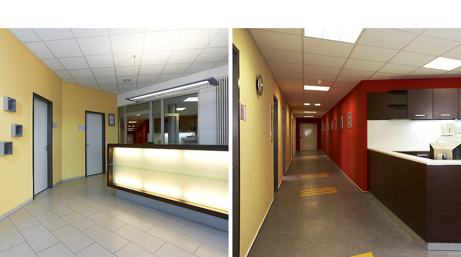 Entwicklung des räumlichen Erscheinungsbildes für Empfang, Patientenraum, Arbeitsräume, Cafeteria und Sanitärbereiche