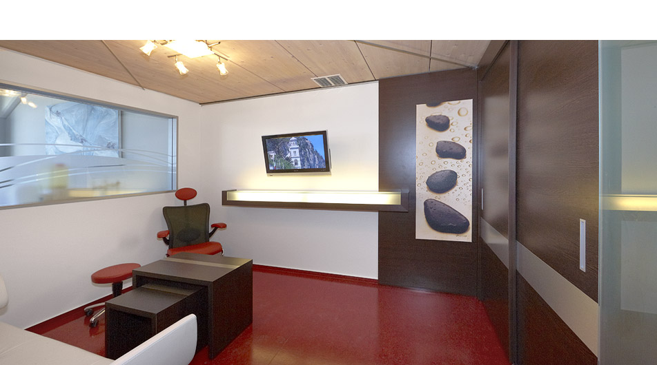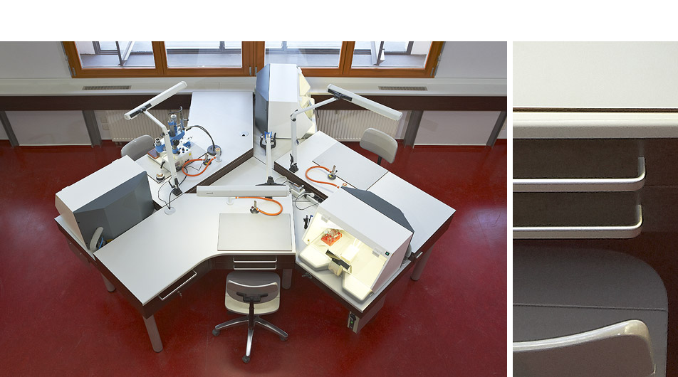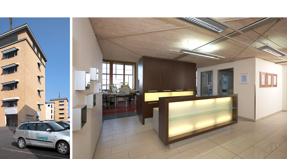 Entwurf des innenarchitektonischen Erscheinungsbildes für Empfang, Patientenraum, Arbeitsräume, Cafeteria und Sanitärbereiche abgestimmt auf das für Lorenz Dental entwickelte Basiskonzept