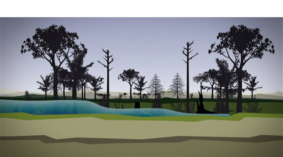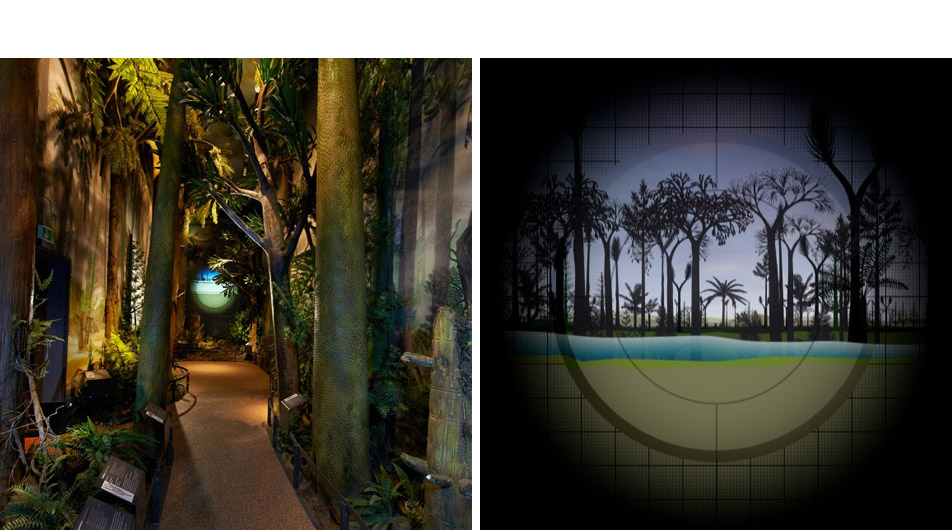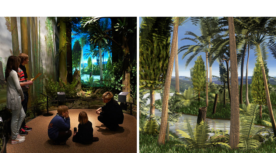 Die spektakuläre Nachbildung eines Steinkohlenwaldes im Bergbaumuseum Oelsnitz wird  multimedial mit Leben gefüllt. Eine Hochkantprojektion mit einer animierten 3D-Ansicht des Waldes fügt sich nahtlos in die Rauminszenierung ein und gibt dem Besucher einen virtuellen Fernblick in die Welt des Karbonzeitalters: längstverschwundene Pflanzen, detailgetreu nachmodelliert, schwanken in einenr leichten Brise, eine Surround-Sound Toninstallation gibt die passende Geräuschkulisse dazu.