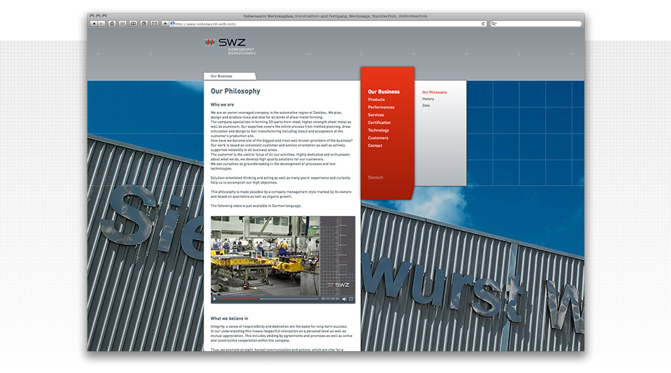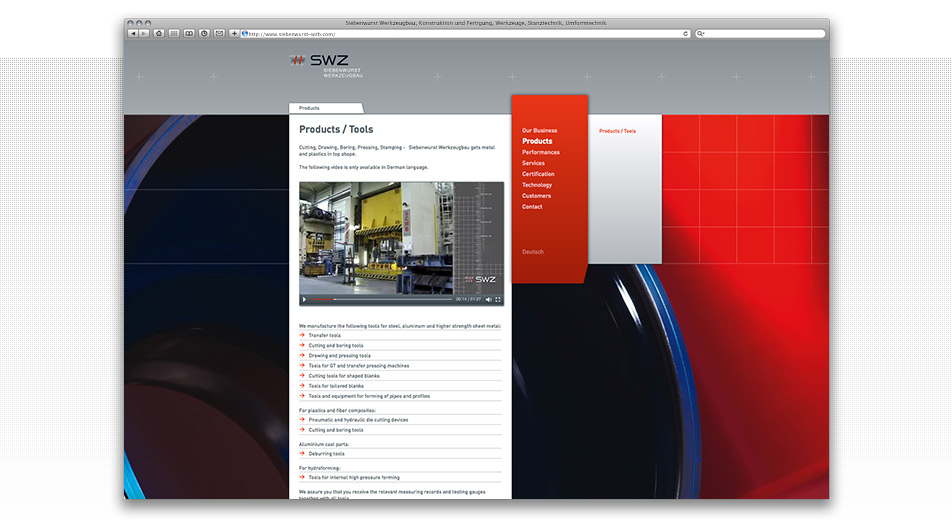 Umgesetzt wurde eine zweisprachige Präsentation mit Content-Management-System. Layout und Bildspache lehnen sich eng an die vorhandenen Umsetzungen an. Um die Leistungsfähigkeit und Innovation des Werkzeugbauers noch deutlicher zu kommunizieren, wurden komplexe Abläufe und Arbeitsverfahren als Video auf der Seite eingebunden.