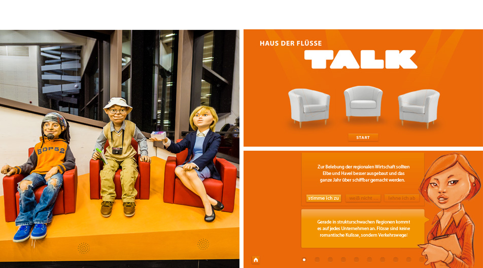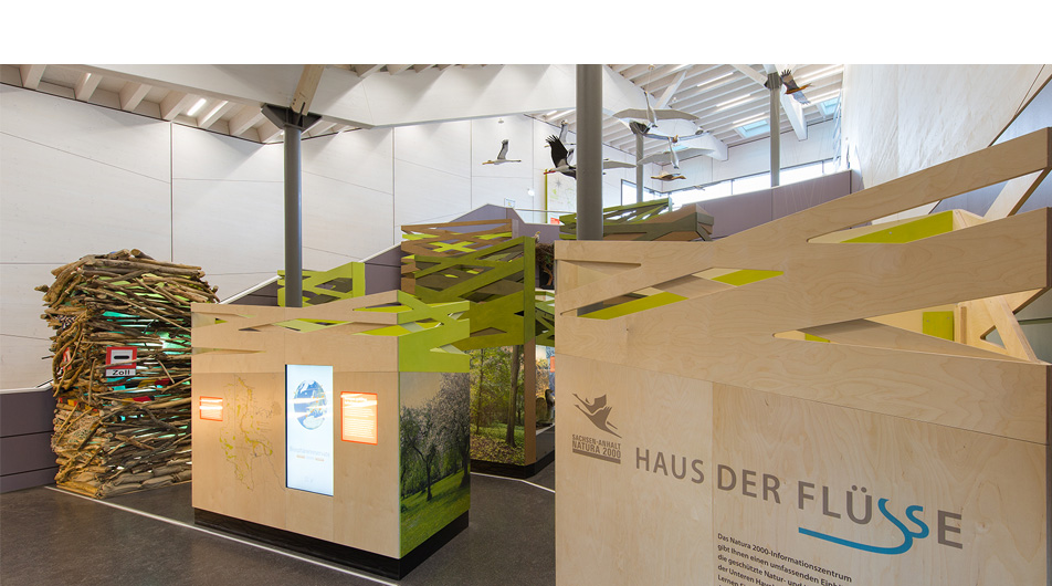 Im Auftrag des Biosphärenreservats Mittelelbe entstand zur BUGA 2015 das Informationszentrum »Haus der Flüsse« in Havelberg. Freigelände und Ausstellung bieten unterhaltsame Spaziergänge durch die Themen der Flussauen von Elbe und Havel mit ihren vielseitig gestalteten Naturräumen und ihrer beeindruckenden Artenvielfalt. Die Inszenierungen sprechen alle Sinne an und bedienen sich unterschiedlichster Medien. Die Ausstellung ist geeignet für Besucher unterschiedlichen Alters, unterschiedlicher Vorbildung und Erwartung sowie auch unterschiedlicher körperlicher Einschränkung. Gebäude, Ausstellung und Freigelände entstanden in enger Kooperation mit Däschler Architekten und Ingenieuren und Petrat Freiraumarchitekten.