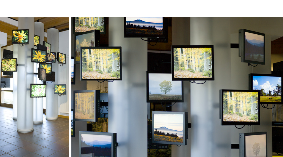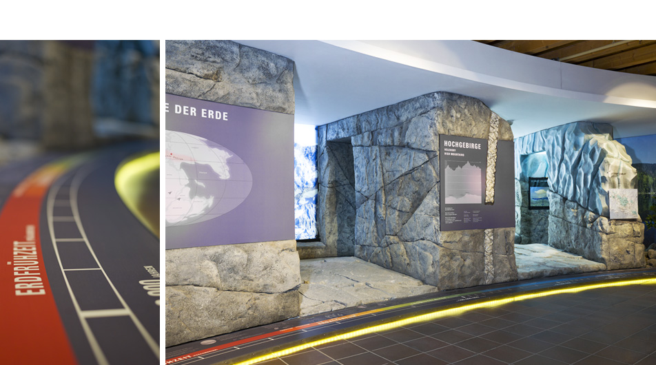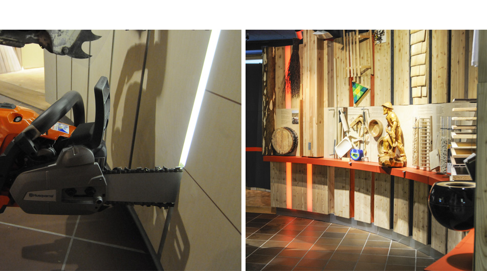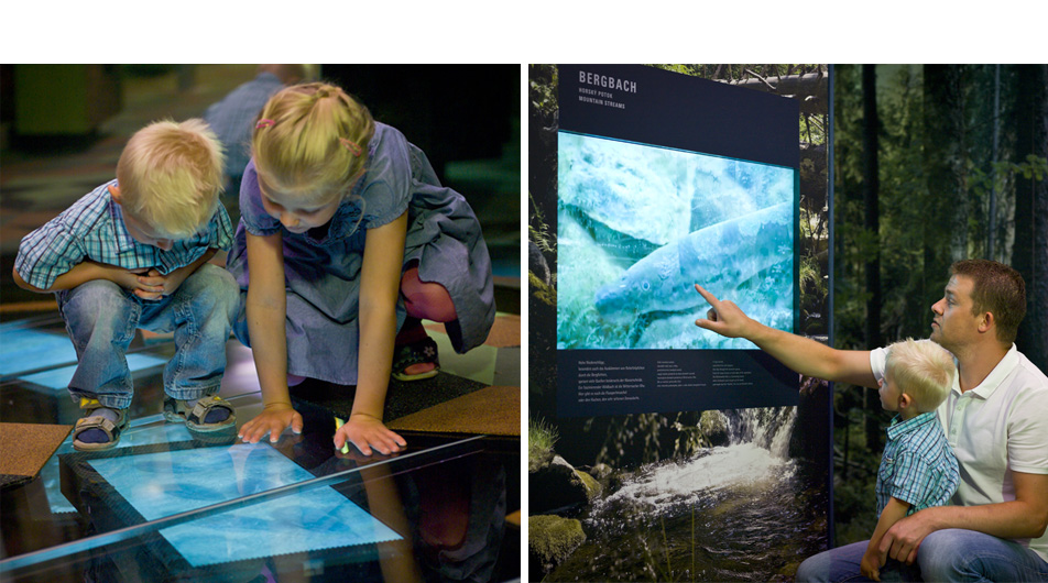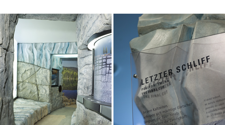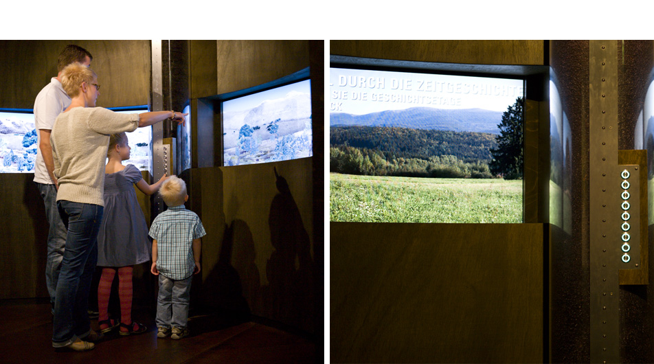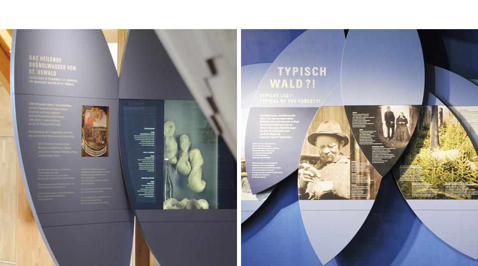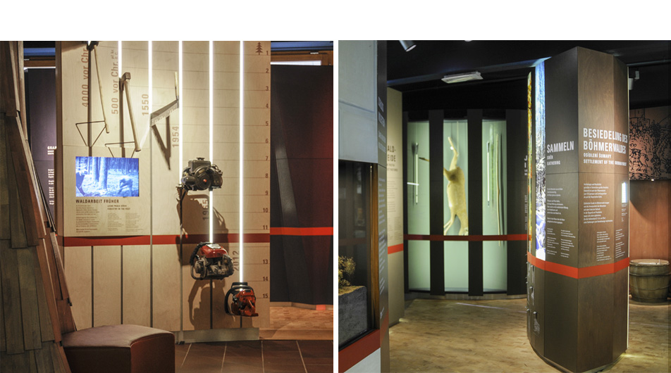Die Struktur des vorhandenen Gebäudes aus den 1980er Jahren bestimmt die Konzeption der Ausstellung zur Waldgeschichte. Die Besucher beginnen ihren Rundgang im Erdgeschoss und erleben die Entstehung einer Landschaft. Sie reisen per »Moorfahrstuhl« in die Vergangenheit, begleiten den Wettlauf der Bäume nach der Eiszeit und lernen typische Waldbilder kennen, die sich je nach Höhenlage entwickeln. Die Besiedlungs- und Nutzungsgeschichte beschreibt das Untergeschoss. Entlang der Handelswege entstanden im Mittelalter Siedlungen. Die Klimaerwärmung gestattet Landwirtschaft im Gebirge. Holznutzung und Glasherstellung bringen Wohlstand. Parallel zur touristischen Erschließung gewinnt der Naturschutz an Bedeutung.