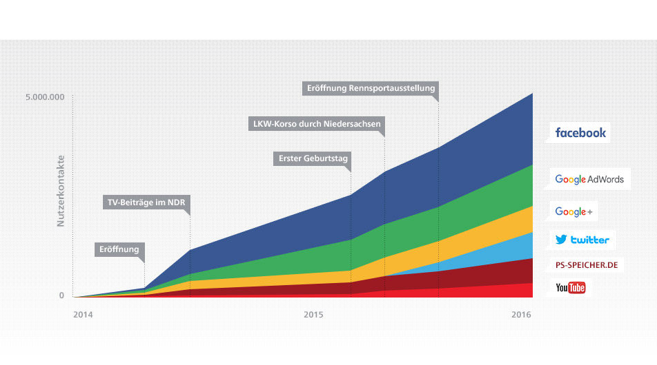 Eineinhalb Jahre nach Eröffnung verfügt der PS.SPEICHER neben einer umfangreichen Website über starke Social Media-Kanäle via Facebook, Twitter und Google+. Monatlich werden so über 100.000 Nutzer crossmedial erreicht.