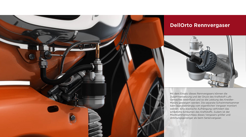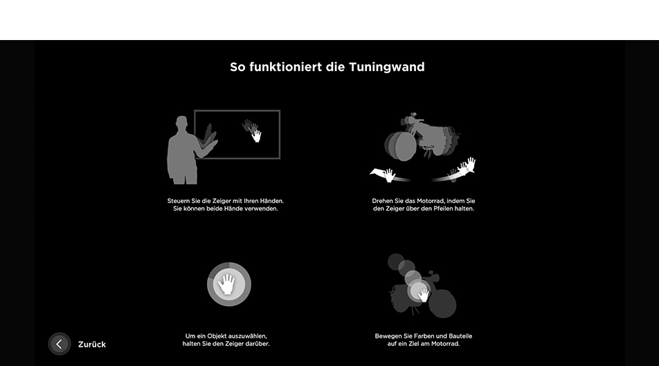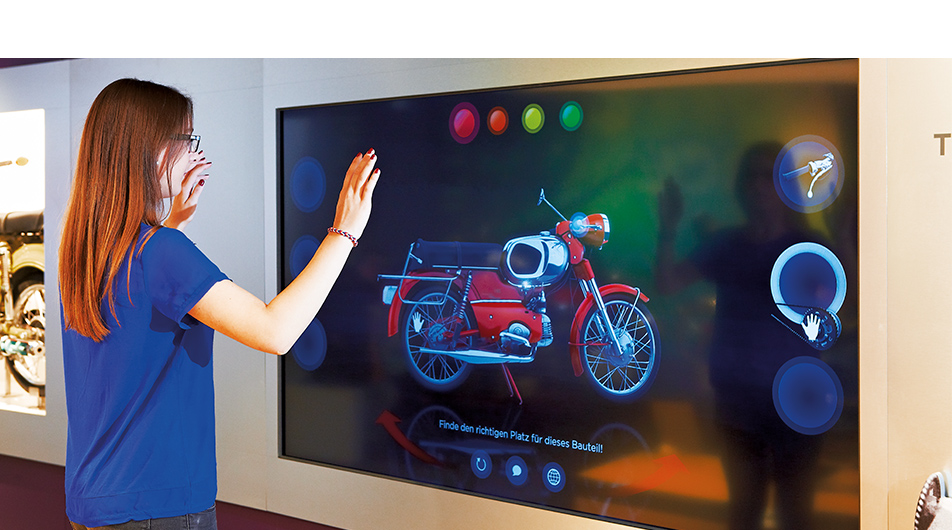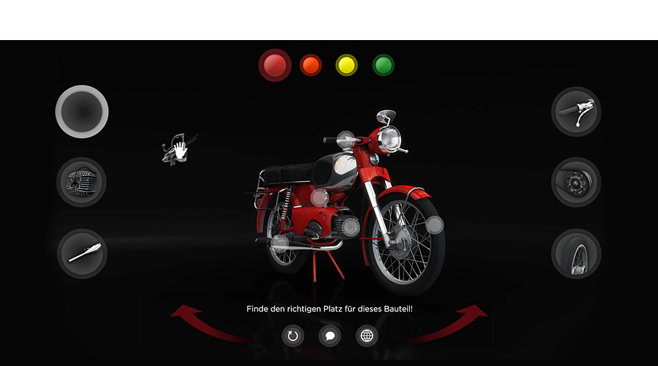 Fertigkeiten mit Schraubwerkzeugen werden allerdings nicht vorausgesetzt. Durch die hochmoderne Gestensteuerung kann unsere interaktive Tuning-Wand von jedem bedient werden. Die Besucher müssen spielerisch die richtigen Stellen für Ersatzteile wie Bereifung, Vergaser, Auspuff oder Zylinderkopf finden. Sie lernen dabei, was für Auswirkungen diese Tuning-Teile auf die Leistung des Mopeds haben. All das auf Basis eines detailliert nachgebauten 3D-Modells der Kreidler Florett.