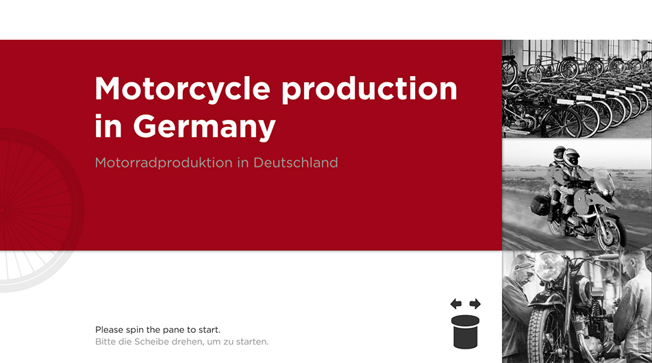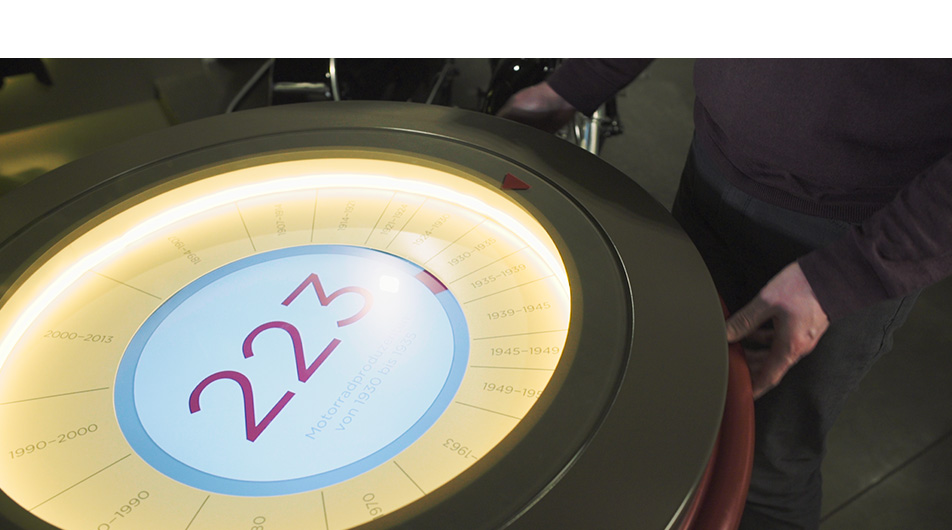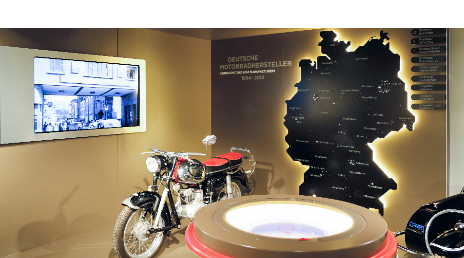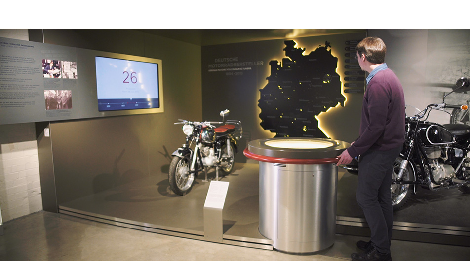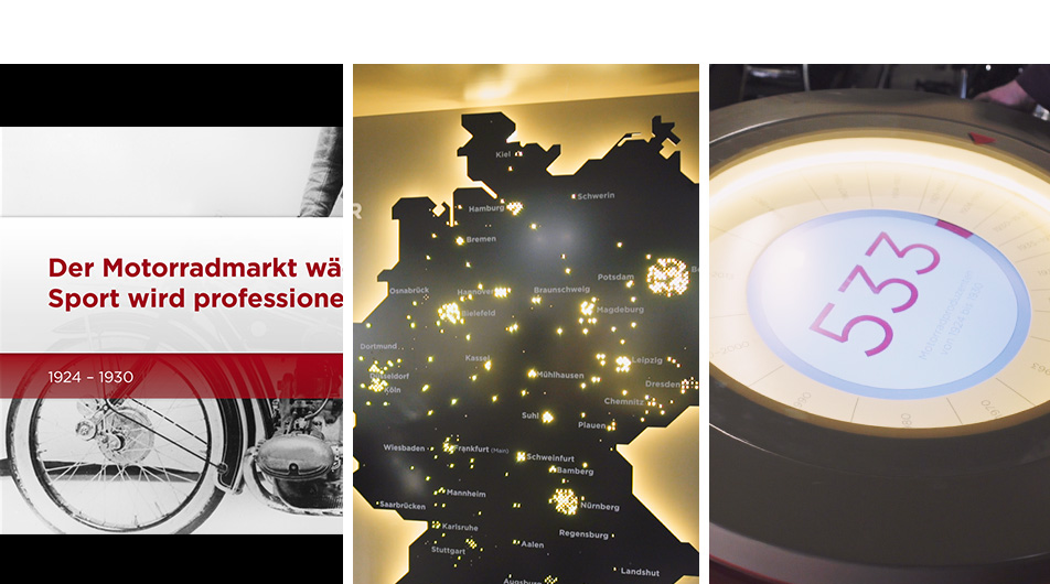 Bei unserer »Drehtonne« steht das Lernen durch Anfassen im Mittelpunkt. Über ein haptisches Element – einen drehbaren Kranz – navigieren die Besucher durch  120 Jahre Geschichte der Motorradindustrie in Deutschland. Auf zwei Displays zeigt eine animierte Zahl, wie viele Motorradhersteller zu einem bestimmten Zeitpunkt aktiv waren. Auf der Wand wird gleichzeitig gezeigt, wo sie ihre Werke hatten: die individuellen LEDs einer Lichtinstallation gehen synchron mit der Drehung an und aus und zeigen so auf der Karte Geburt (und Verschwinden) hunderter historischer, heute größtenteils vergessener Marken. Wer mehr lernen will, kann einen bestimmten Zeitabschnitt auswählen und näher erkunden: 16 Filmeinspieler erzählen über die Entwicklung der Motorradindustrie in der jeweiligen Epoche.