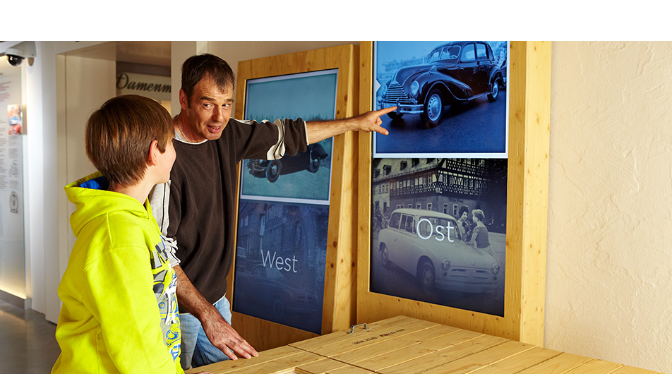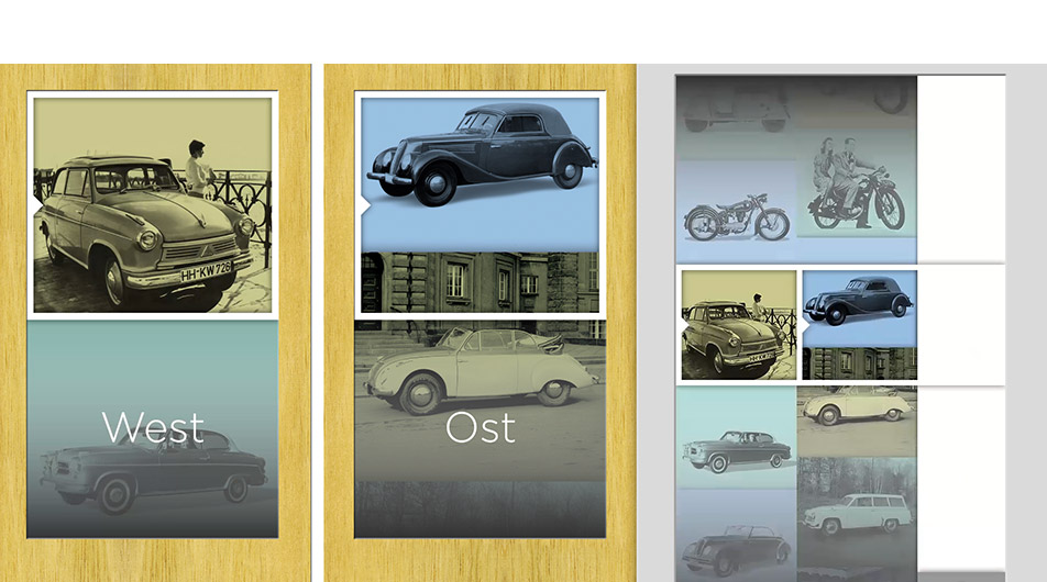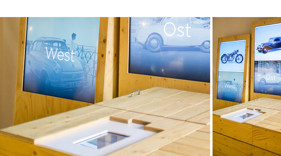 Unsere Medienstation im Saal 5 des PS.SPEICHERs lädt die Besucher ein, interaktiv zu entdecken, welche Fahrzeuge in der Nachkriegszeit Ost- und Westdeutschlands weitgehend baugleich waren.
