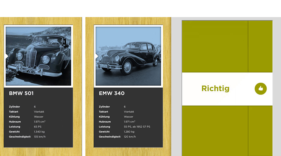 Über ein kleines Touchdisplay versuchen die Spieler, die richtigen Paare zu finden. Zwei großformatige Hochkantdisplays zeigen synchron Fotos des ausgewählten Ost- und Westfahrzeugs mit weiterführenden technischen Informationen.
