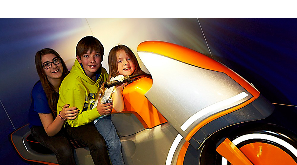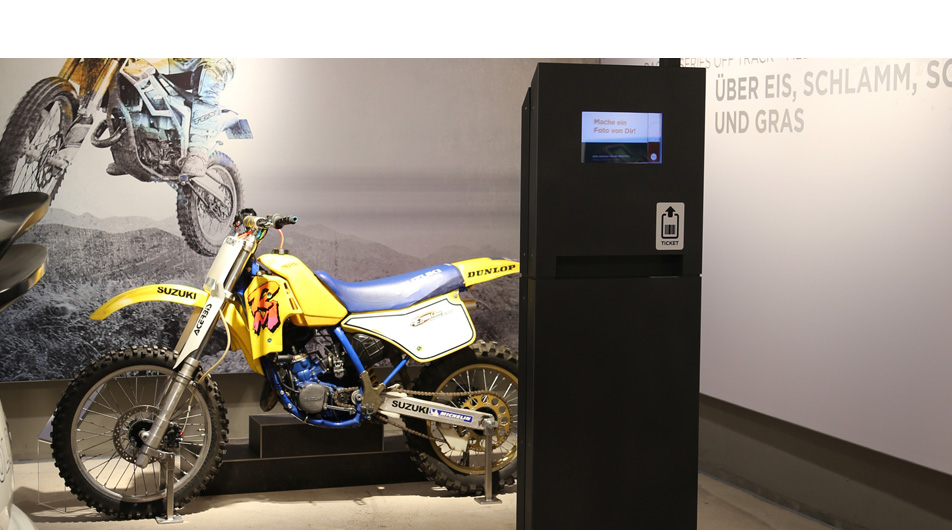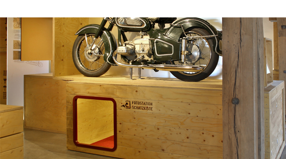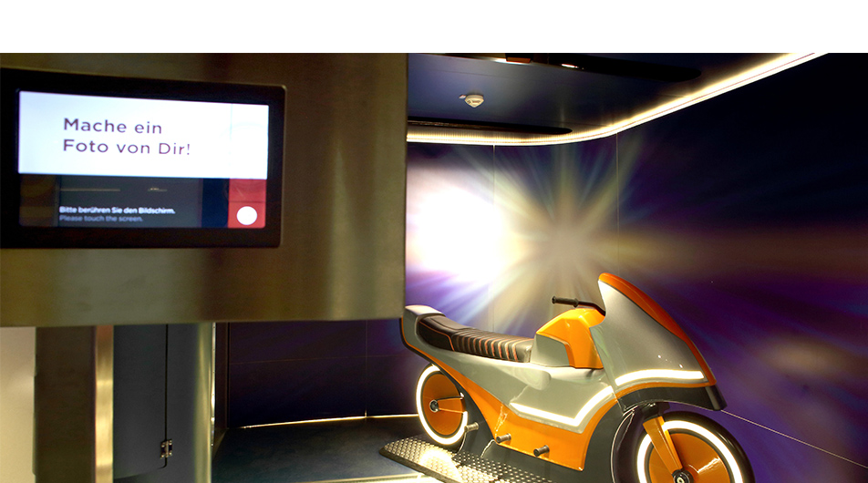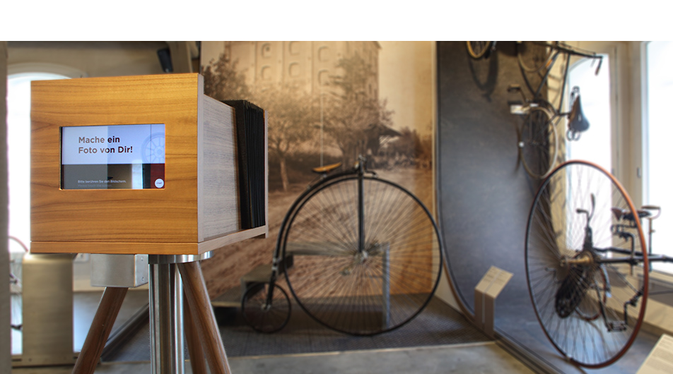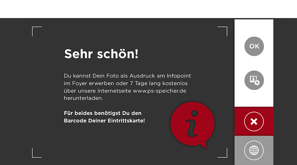 Vier Inszenierungen stehen im PS.SPEICHER für außergewöhnliche Erinnerungsfotos zur Verfügung. Digitale Kameras – in den Ausstellungselementen versteckt – lassen sich kinderleicht über Touchpanels bedienen: Live-Bild-Vorschau oder Timer-Aufnahmen inklusive. Über einen Barcode-Leser werden die so entstandenen Fotos einem bestimmten Einlassticket sicher und anonym zugeordnet.