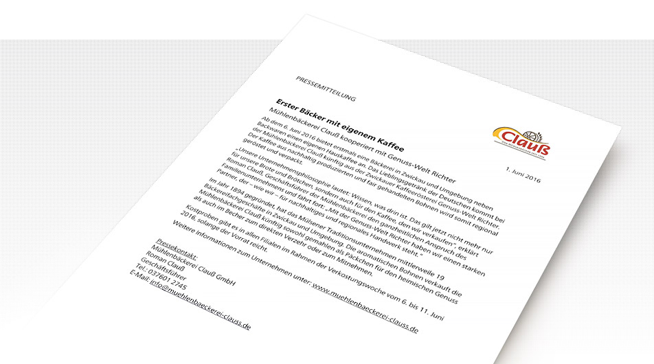 Im Vorfeld der Kaffeeeinführung wurde ein regionaler Presseverteiler zusammengestellt, persönliche Gespräche mit lokalen Medienvertretern geführt sowie eine Pressemitteilung verfasst und inklusive Bildmaterial verschickt. Zudem wurden zusätzliche Bildwünsche der Redaktionen sowie der Dreh von TV Zwickau in einer der Fachgeschäfte koordiniert. Die Presseresonanz in Print-, Online- und TV-Medien wurde der Mühlenbäckerei Clauß im Nachgang der Produkteinführung zugesandt.