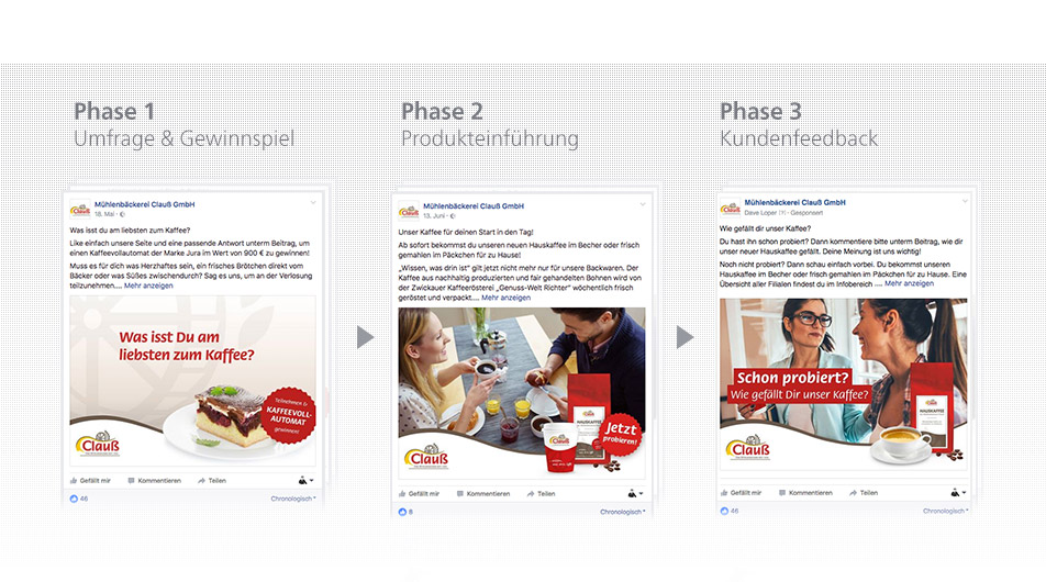 Die Produkteinführung begann mit einem Gewinnspiel. Beworben wurde es online bei allen regionalen Facebook-Nutzern rund um die 19 Bäckereifachgeschäfte sowie offline mittels Teilnahmekärtchen in den Geschäften. Für Kaffee sensibilisiert, erfuhren Koffein-Interessierte in der zweiten Phase von der Einführung des »Hauskaffee«, verbunden mit einer Verkostungswoche. Die abschließenden Online-Werbe-Postings verwiesen auf die Facebook-Seite der Bäckerei, direkt zur Filialübersicht.
