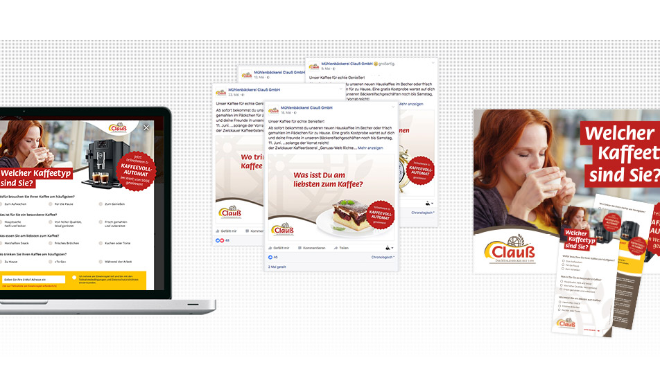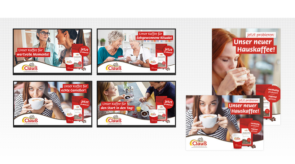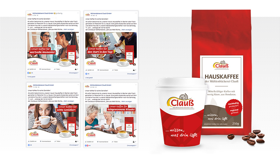 Kaffee beim Bäcker ist alltäglich, fair gehandelte und regional geröstete Eigenmarken hingegen äußerst selten. Der »Hauskaffee« der Mühlenbäckerei Clauß ist der erste dieser Art in Westsachsen. Neben dem Produktdesign, der Filialwerbung und der Pressearbeit begleiteten wir die Einführung des Hauskaffees von Mai bis Juli 2016 mit einer mehrstufigen Facebook-Kampagne. Aufgabe: Kampagne konzipieren, durchführen und auswerten. Erstellte Anzeigenformate wurden zudem auf Displays in den Filialen, auf der eigenen Website und im Newsletter geschalten.
