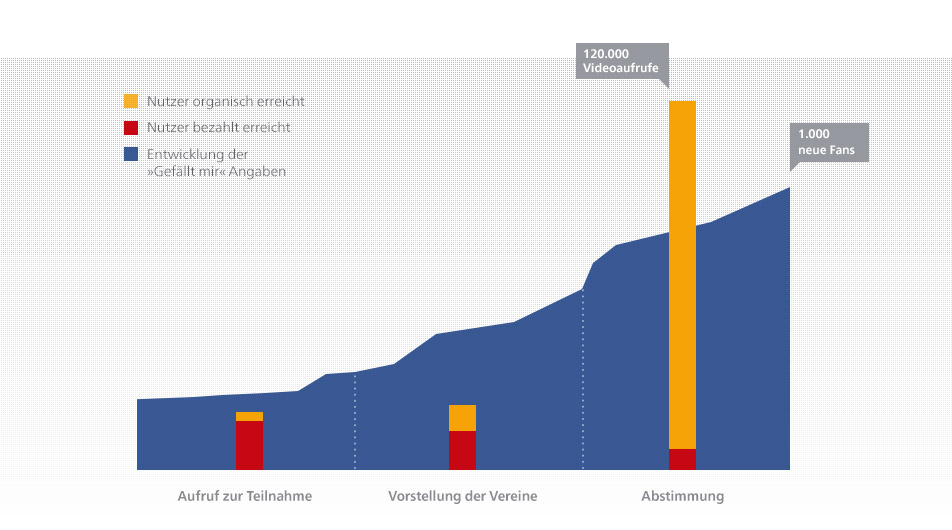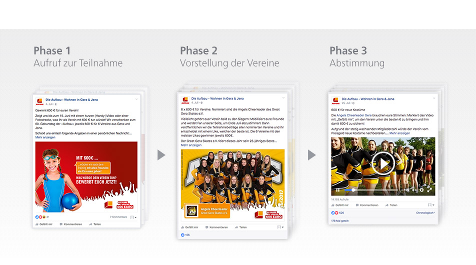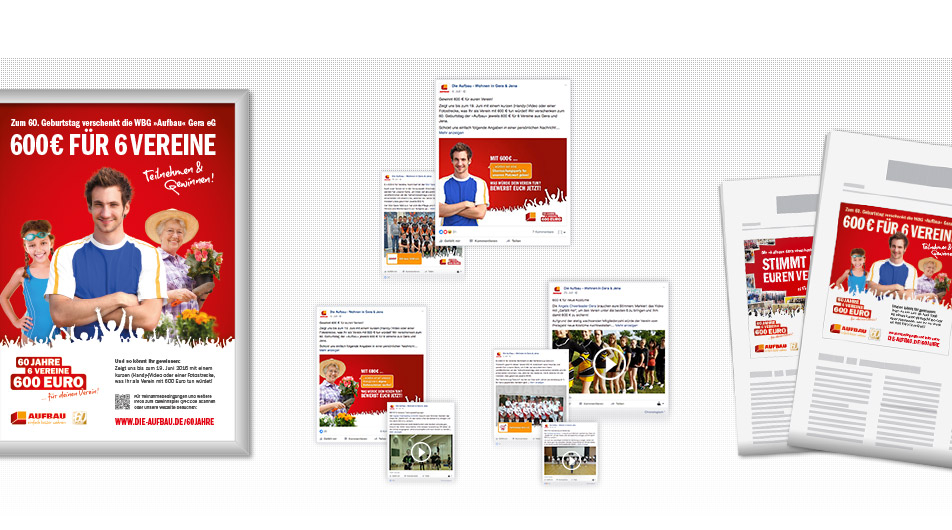 Unter dem Titel  »60 Jahre, 16 Vereine, 600 Euro« bewarben sich knapp 50 Vereine innerhalb von 6 Wochen. In einem 1-minütigen Videoclip erklärten sie, was sie mit 600 Euro tun würden. Mittels Losverfahren wurden 16 von ihnen ausgewählt und über 4 Wochen mit Foto auf Facebook vorgestellt. Weitere 4 Wochen standen die 16 Videos zur Abstimmung im »Aufbau« - Facebook-Kanal. Über die Gesamtlaufzeit von 4 Monaten erreichte die Kampagne über 150.000 Facebook-Nutzer mehrfach. Allein die 16 Videos erhielten rund 120.000 Aufrufe. Die WBG »Aufbau« gewann zudem knapp 1.000 dauerhafte Fans. Flankiert wurde die Online-Kampagne mit temporären Werbeanzeigen und einem Direktmailing als Bewerbungsaufruf.