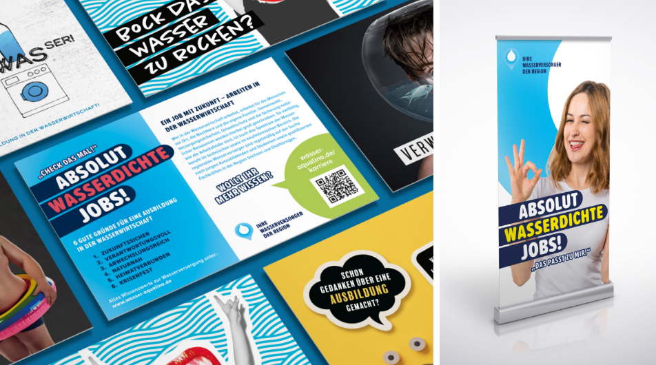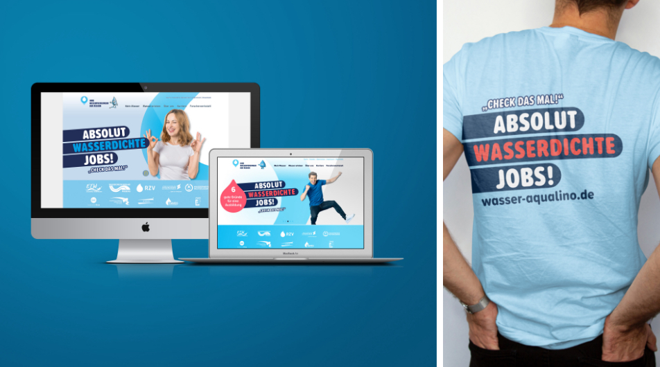 In Zusammenarbeit von Texter, Grafikerin, Web- sowie Motiondesigner entstanden Slogans und Kampagnendesign, die auf Infomaterialien, T-Shirts, im Internet und Edgar-Freecards Anwendung fanden. Und sogar dieser Werbeclip wurde durch unsere Multimedia-Abteilung realisiert: bit.ly/blog_Aqualino-Azubifilm
