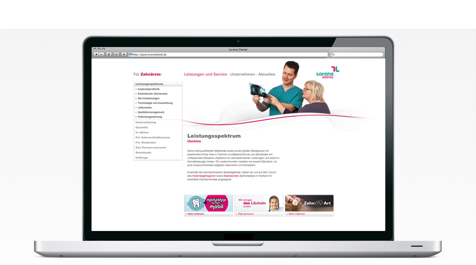 Umgesetzt wurde eine Internetpräsentation auf Basis des CMS »redaktör« von ö_konzept. Patienten erfahren unter anderem, warum sich hochwertiger Zahnersatz lohnt und bei welchen Zahnärzten Sie ihn bekommen. Zahnärzten steht neben der fachlichen Leistungsvorstellung ein Weiterbildungskalender mit Online-Anmeldung sowie eine Reihe von Unterstützungsangeboten für ihre tägliche Arbeit zur Verfügung.