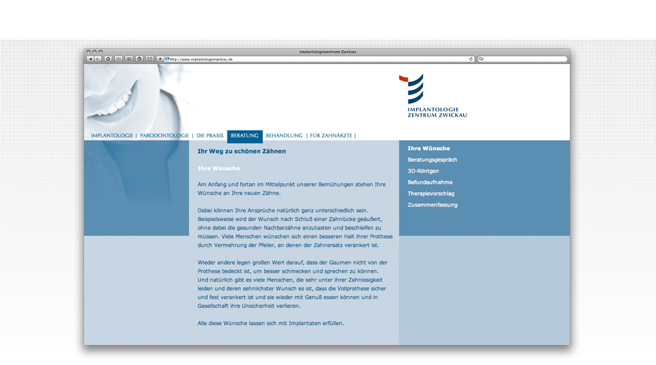 Im Rahmen der Neukonzeption galt es, die zwei Zielgruppen Patienten und Zahnärzte zu erreichen. Den Patienten sollte der Nutzen von Zahnimplantaten kommuniziert werden, während sich Zahnärzte in erster Linie über Weiterbildungen und Hospitationsmöglichkeiten informieren können.
