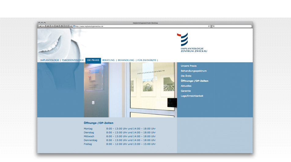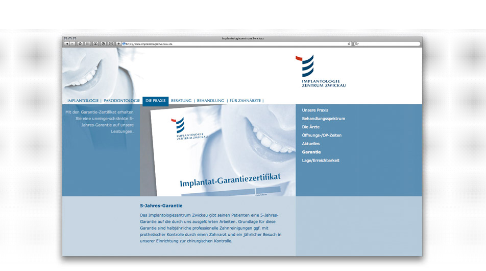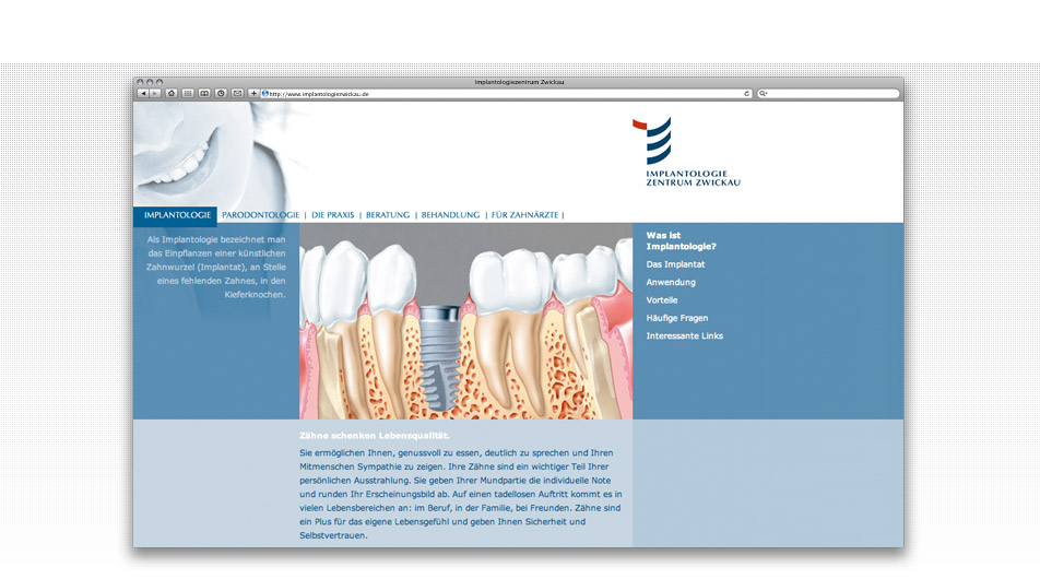 Umgesetzt wurde eine Präsentation mit Content-Management-System. Um Nutzwert und Einsatz von Implantaten zu verdeutlichen, wurden für die Patienten drei kleine Flash-Filme für die Anwendungsbereiche Sportunfall, Ästhetik und Zahnersatz erstellt. Für interessierte Zahnärzte und Kollegen befindet sich ein Weiterbildungskalender auf der Internetseite.