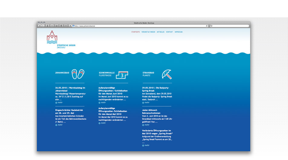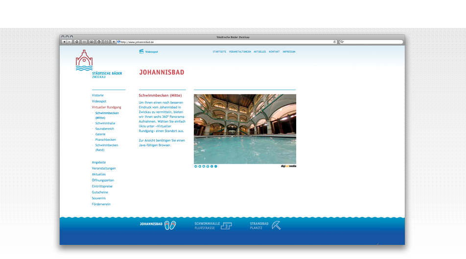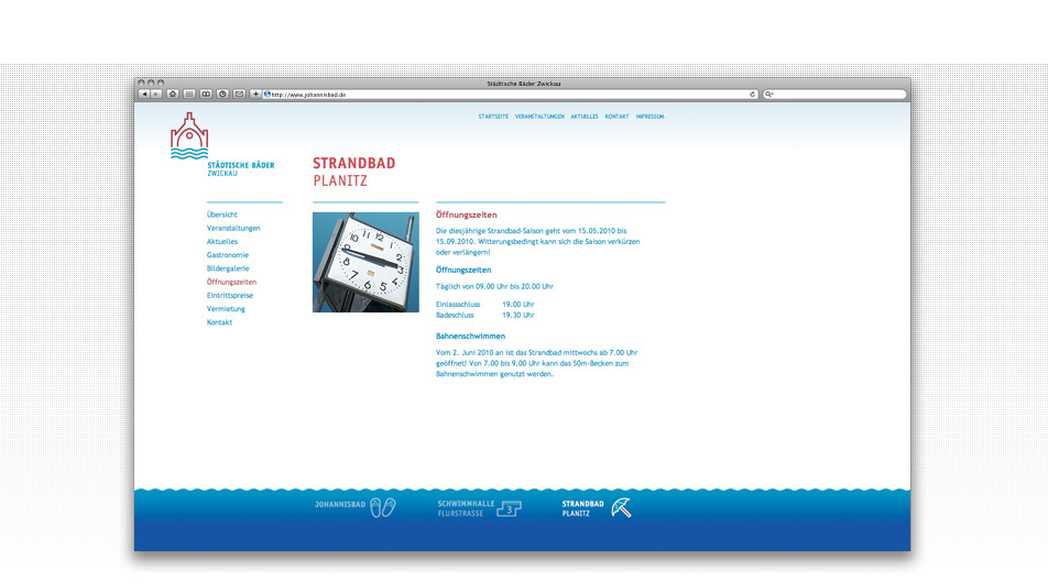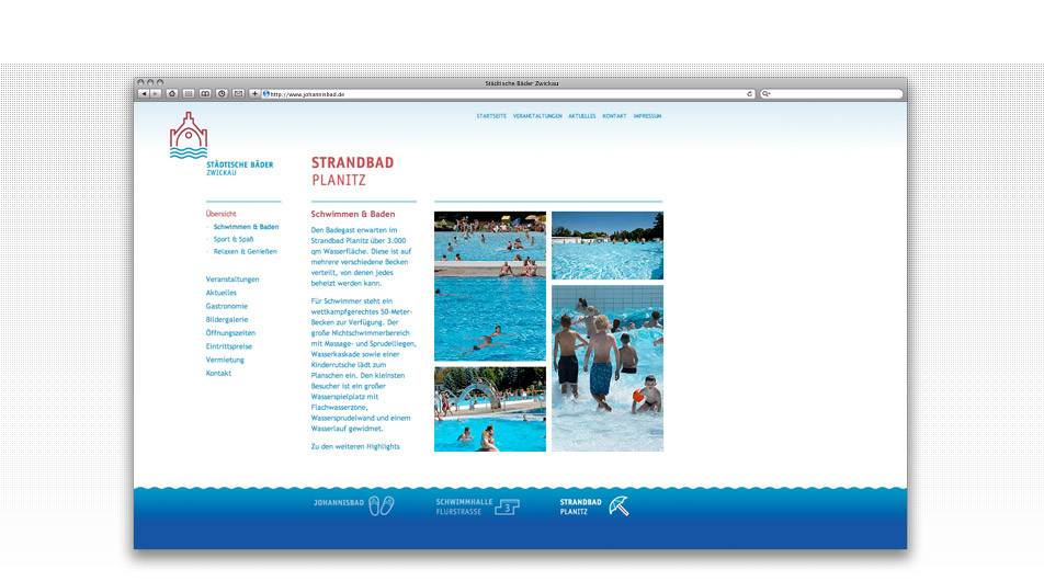 Die Umsetzung beinhaltet die Präsentation der drei städtischen Bäder in Zwickau. Besucher der Website können sich über die Möglichkeiten der Freizeitgestaltung, Veranstaltungen, Eintrittspreise und Öffnungszeiten informieren. Die Umsetzung erfolgte auf Basis des Cotent-Management-Systems »redaktör« von ö_konzept und verfügt über eine Schnittstelle zur Zwickauer Veranstaltungsplattform Zwickau-Aktuell.de (Link) für denautomatischen Datenaustausch.