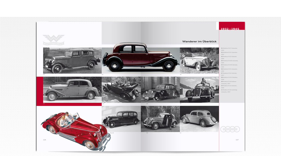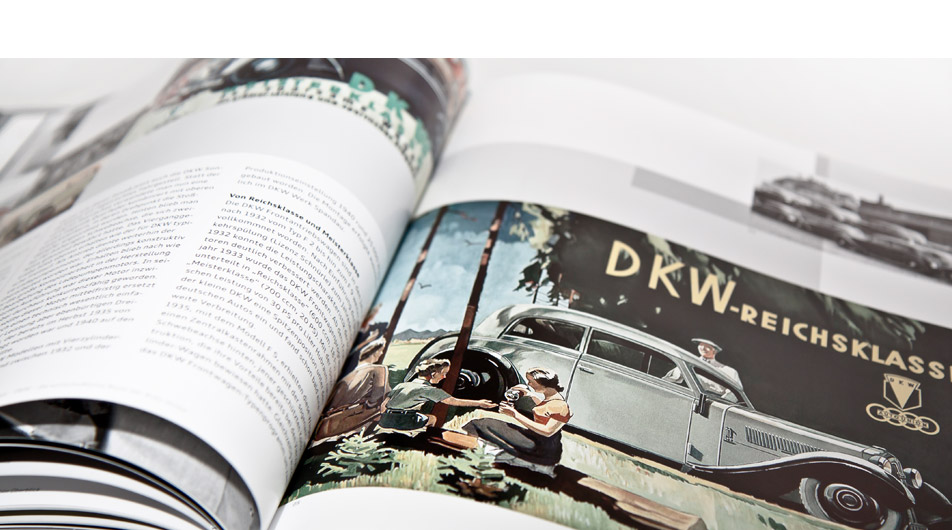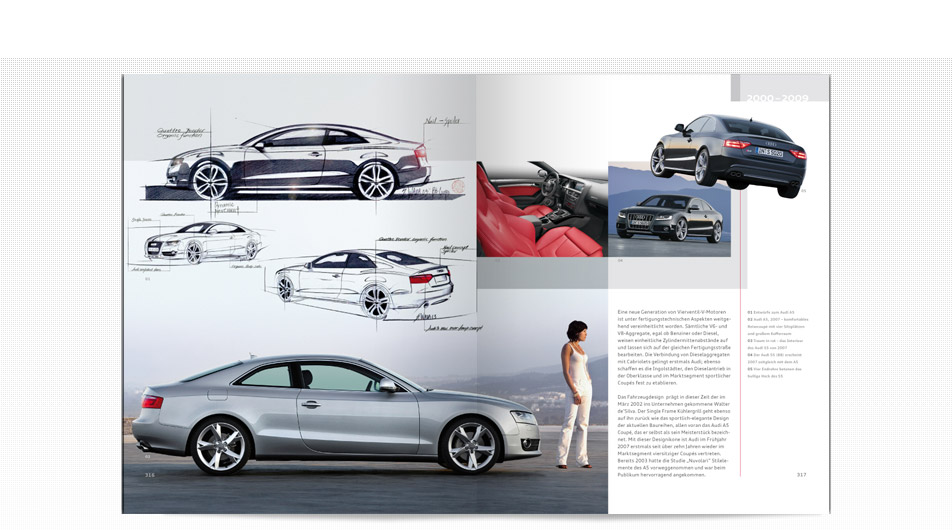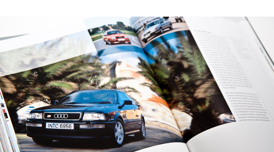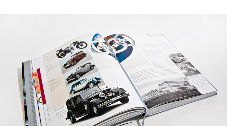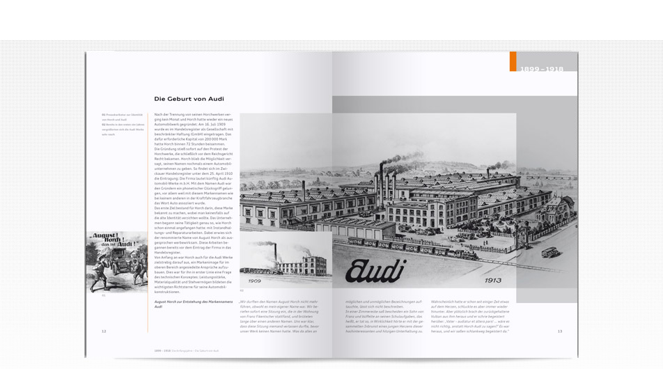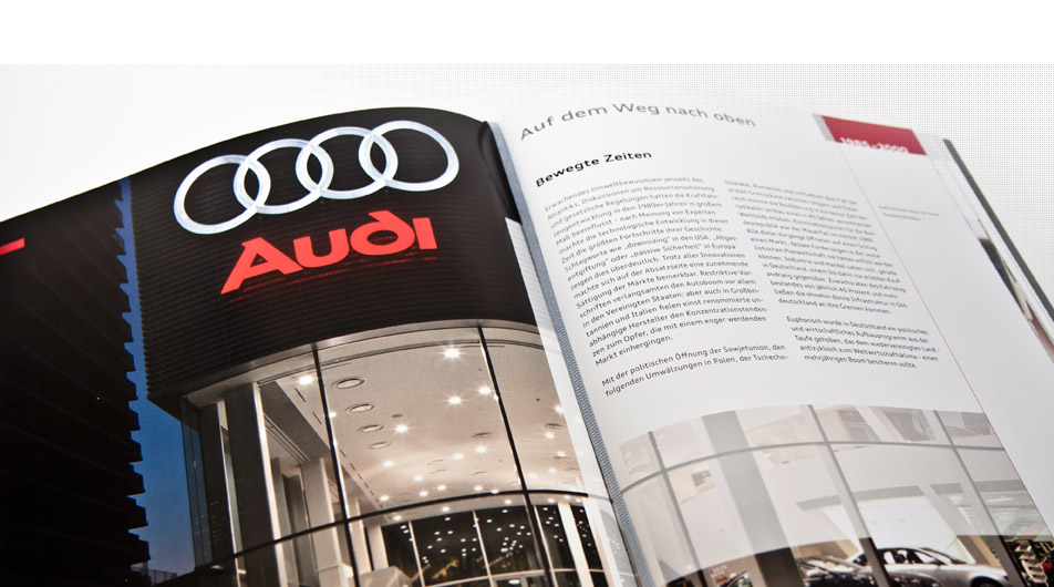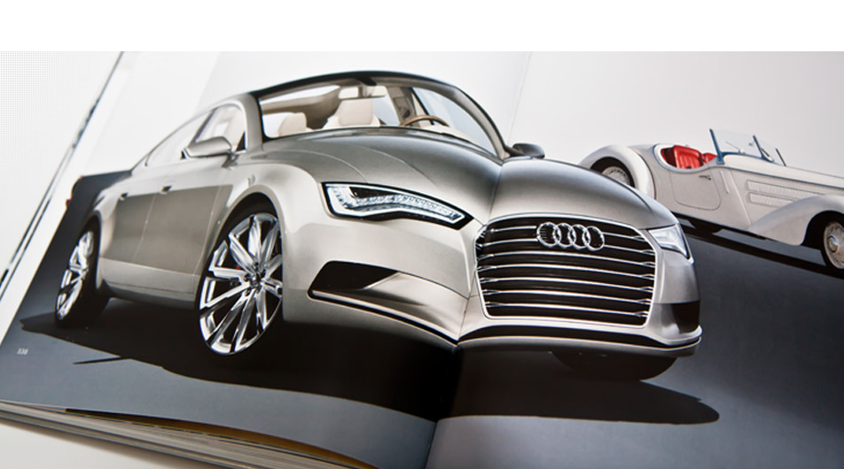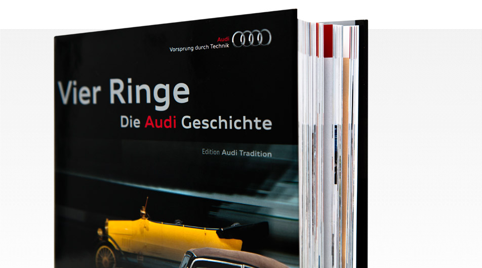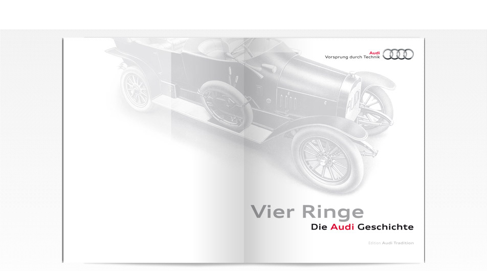 Anlässlich des 100-jährigen Firmenjubiläums galt es die Audi-Geschichte in neuer Form umfassend, spannend und informativ aufzubereiten. Als Fortsetzung der bis dato unter dem Titel »Das Rad der Zeit« erschienenen Buchreihe sollte das neue Werk gegenüber seinen Vorgängern optisch wie inhaltlich – entsprechend dem historischen Anlass – eine neue Wertigkeit reflektieren. Zentraler Schwerpunkt war dabei die angestrebte Symbiose zwischen Design-Bildband und Nachschlagewerk.